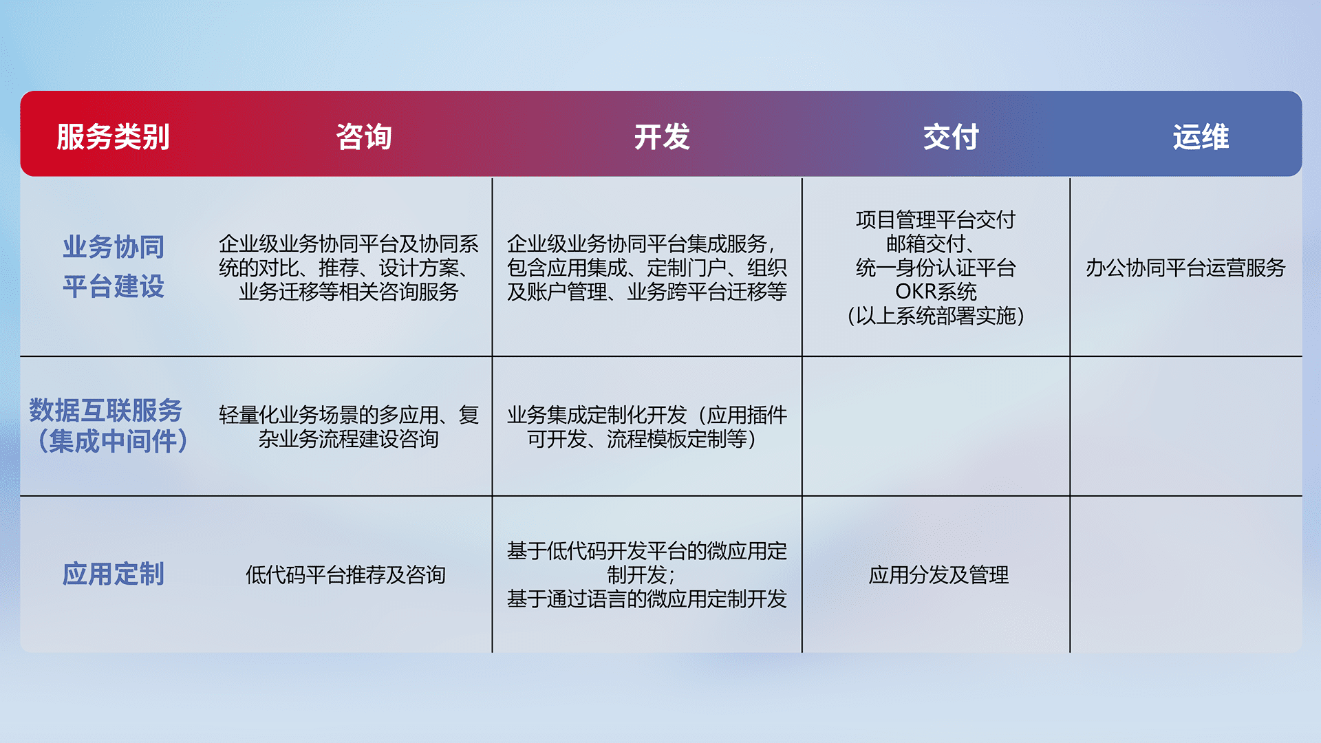 针对钉钉、、企微、、、、IDaas等平台级产品提供产品的规划、、、、方案、、、、交付、、定制化开发等服务,,,,实现如统一协同办公、、、智能客户服务、、、混合会议管理、、、智能数据查询、、、、等业务场景,,,,实现数字化转型。。